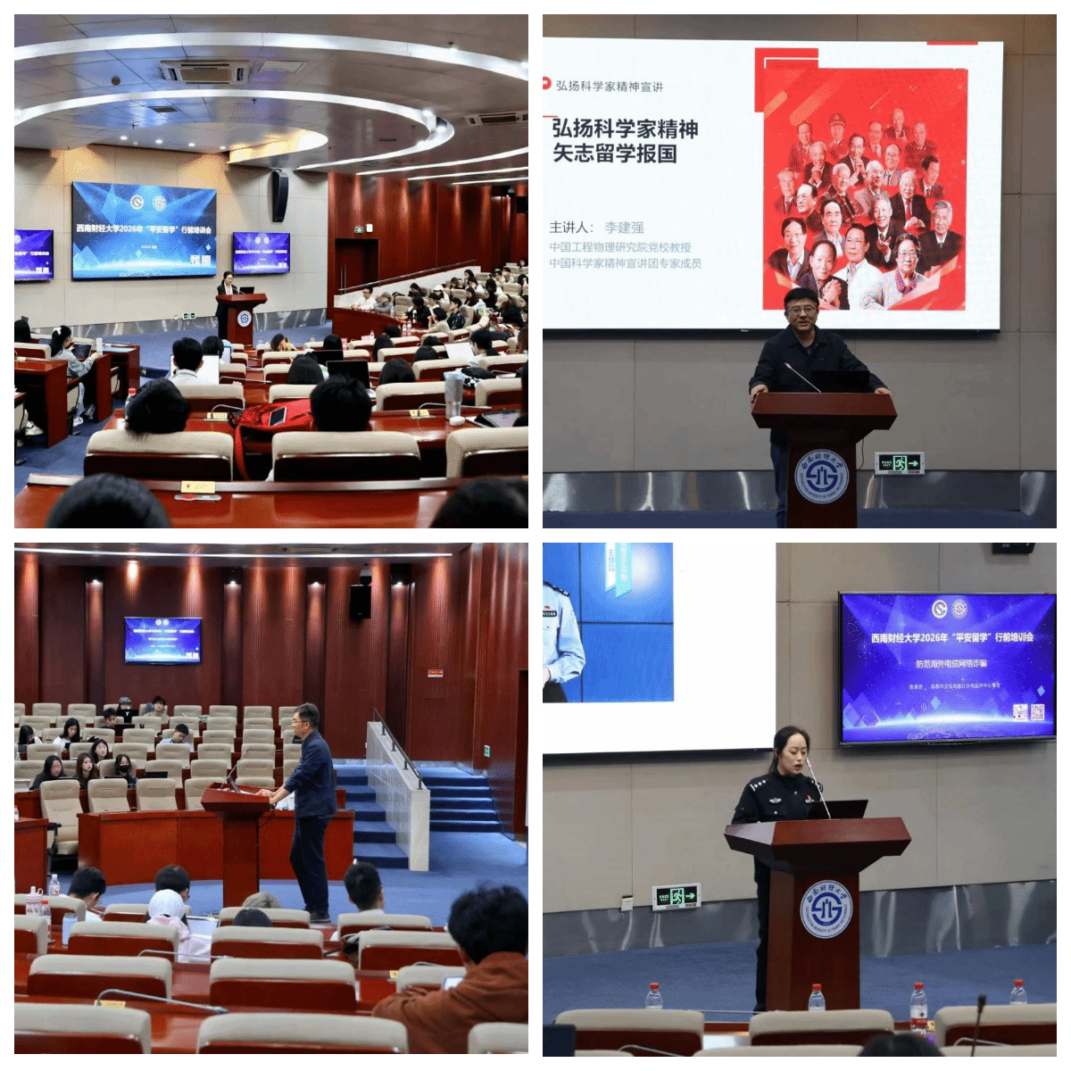 国际交流与合作处、中国工程物理研究院、四川省委外办涉外安全处、成都市公安局温江分局反诈中心等单位的专家领导从精神引领、安全形势分析到实际问题的处理,全方位为学子答疑解惑、加油鼓劲。为即将踏上留学征程的西财学子送上了知识、精神与安全的三重“礼包”,助力学子在国际大舞台上绽放光彩,在异乡求学路上平安顺遂。